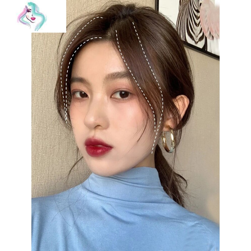 刘海三七分,将发量偏多那一侧的发尾内弯成C字型,弧线轮廓看起来像个跳跃的逗号,弯落在眉毛上,这就是传说中的逗号刘海啦。