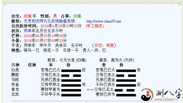 预测术种类凡多各有各的功能你比如说要测天气八字就预测不了八字是分析长远的分析人的穷通祸福的玄心今天给大家讲六爻卦,六爻卦主要是预测分析单一的一件事件成败得失吉凶卜易之道乃伏羲文王周公孔子四大圣人之;你也不说下性别,看卦,应该是个男孩子的八字吧这个八字的命主性格率真坦诚,缺乏心计,孩子气甚重,感情丰富,所以对文学方面能有较深刻的体会以后读文科的可能性大,从事文职一类的工作孩子会有眼疾另外说一下;八字起六爻卦测事,年支数加月分加日之和除以8,余数取上卦,再加时数,总数除以8余数作下卦,总数除以6余数取动爻。