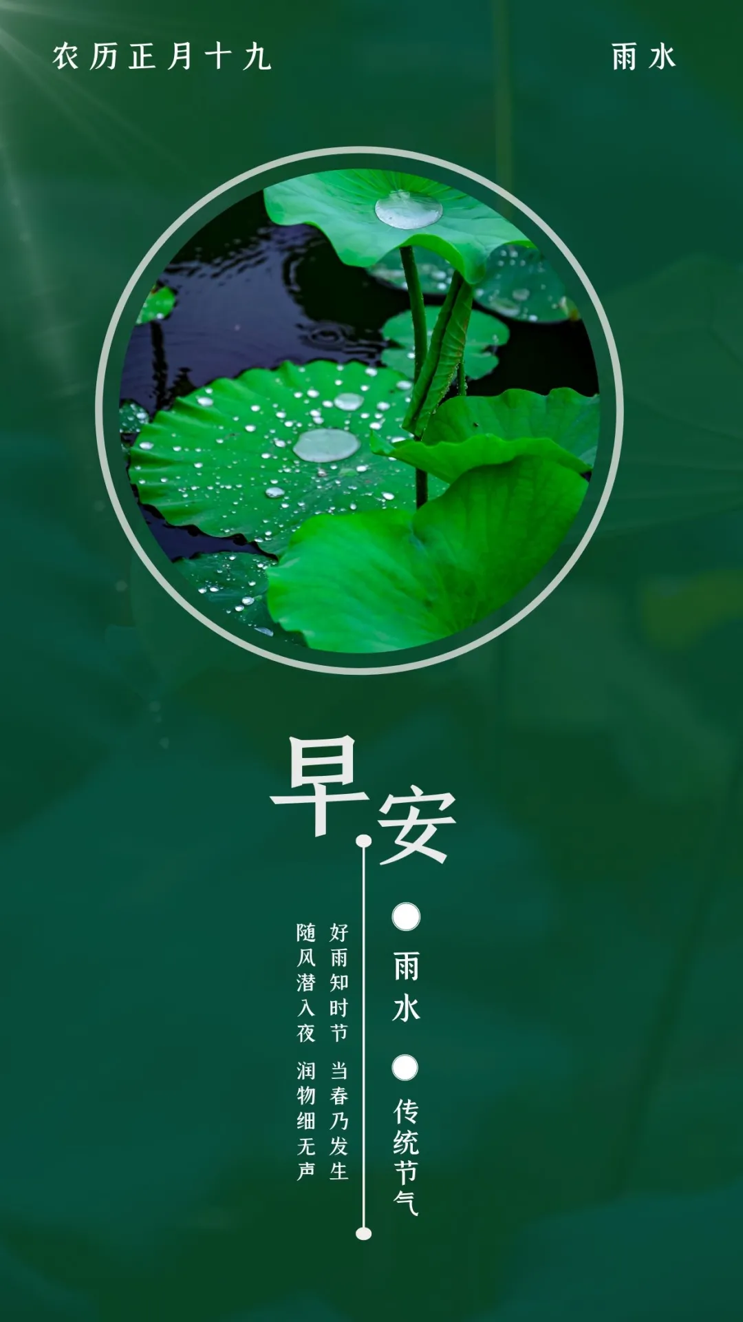 雨水到来天地欢,万物焕发新容颜。甘霖普降润无声,田野蓬勃五谷丰。扛起犁铧勤劳作,来年收获特别多。风调雨顺好年成,幸福快乐美梦成。雨水快乐!